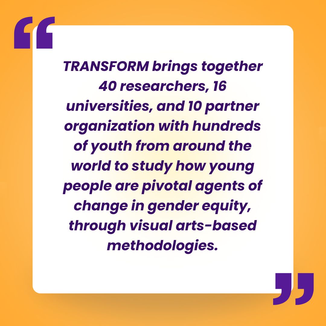 Gender inequalities and discrimination persist glaringly around the globe with gender-based violence standing out as one of the most widespread human rights violations. TRANSFORM brings together 40 researchers, 16 universities, and 10 partner organizations —including NGOs, policy actors, and publishers —with hundreds of youth from around the world to study how young people are pivotal agents of change in gender equity, specifically through visual arts-based methodologies.